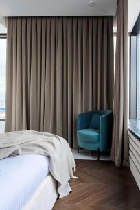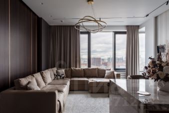 Панорамные окна наполняют апартамент естественным светом и открывают виды на центр Москвы, создавая ощущение простора и воздуха.