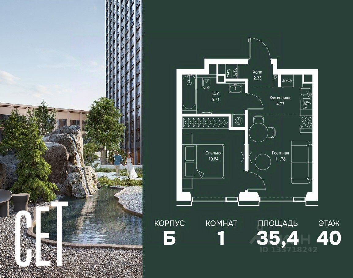 В ЖК Сет продается 1-комнатная квартира площадью 35.43 м², расположенная в корпусе Б, на 40 этаже 59 этажного дома.