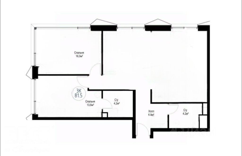 Кухня-гостиная 42 м², две спальни 16 м² и 13,6 м², два санузла.