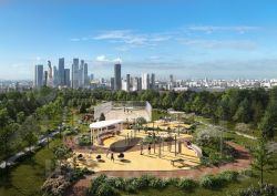 ЖК "Амбер Сити": многоуровневый ландшафт на 6 гектарах с зелёным бульваром, объединяющим арт-объекты, водные зоны и архитектурные формы. В закрытых дворах на стилобате - детские площадки с сенсорными элементами, зоны отдыха с креслами и настилами для йоги. Навесы с подогревом и зарядками для зимнего сезона.
