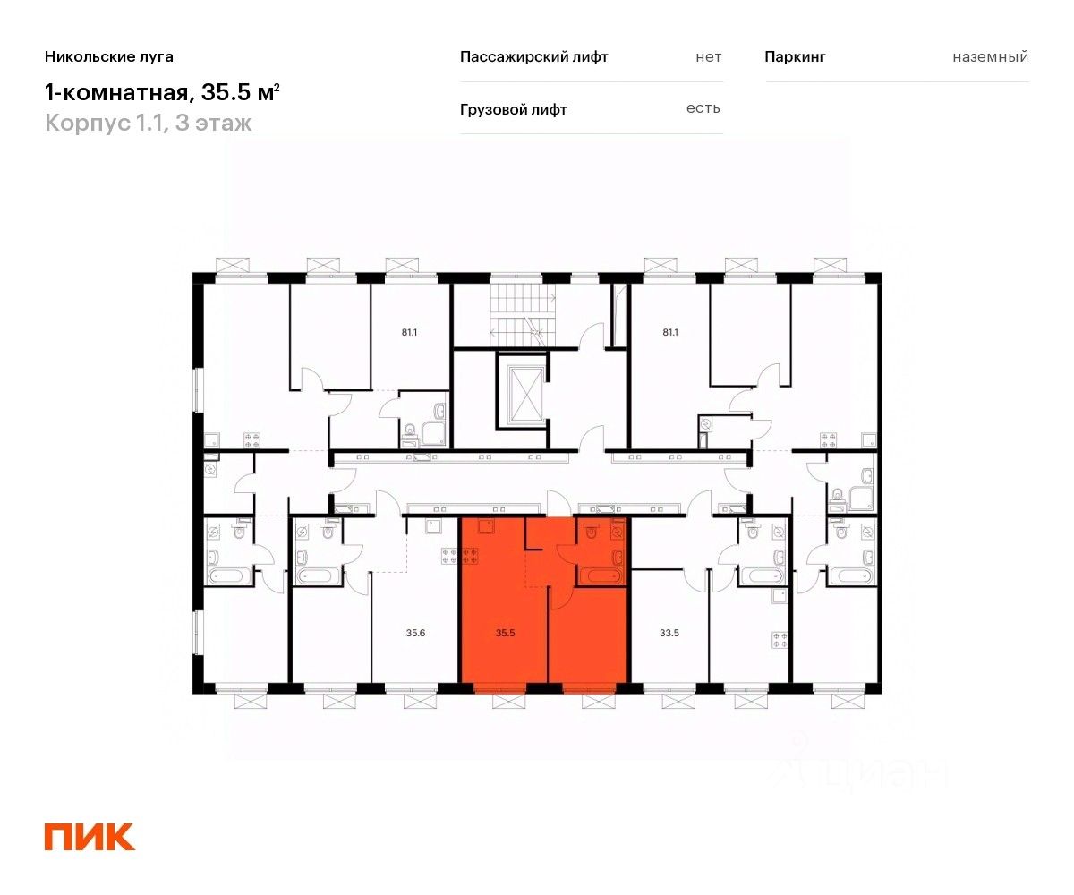 Продаётся 1-комн. квартира площадью 35,5 кв.м на 3 этаже 9 этажного дома (Корпус 1.1, Секция 2) проекта ПИК Никольские луга. Светлый просторный подъезд на уровне земли, функциональная планировка, большие окна, c отделкой.