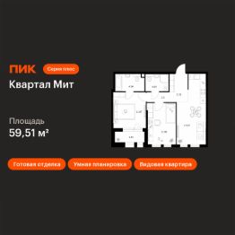 Продаётся 2-комн. квартира площадью 59,51 кв.м на 22 этаже 32 этажного дома (Корпус 3.4, Секция 4) проекта ПИК Квартал Мит. Светлый просторный подъезд на уровне земли, функциональная планировка, большие окна, c отделкой.