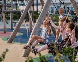 Все корпуса в квартале гармонично сочетаются, образуя единую городскую среду. Между собой их объединяет невысокая этажность и натуральная цветовая гамма. Здесь приятно гулять и проводить время на улице всей семьёй.