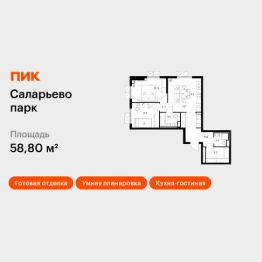 Продаётся 2-комн. квартира площадью 58,8 кв.м на 12 этаже 22 этажного дома (Корпус 56.2 , Секция 3) проекта ПИК Саларьево парк. Светлый просторный подъезд на уровне земли, функциональная планировка, большие окна, c отделкой.