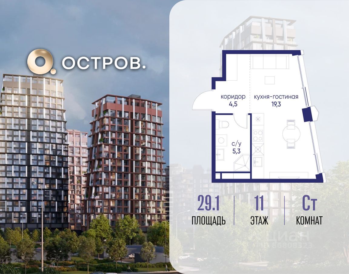 Продаётся квартира от застройщика: общая площадь 29.10 м², жилая 14.30 м², кухня 5.00 м², 11-й этаж, жилой квартал "Остров 14", корпус 6 (секция 1). Срок сдачи: 2 квартал 2029 года.