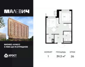 Продаётся 1-к квартира 39.3 кв.м. на 26-м этаже 28 этажного дома.