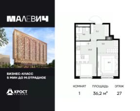 Продаётся 1-к квартира 36.2 кв.м. на 27-м этаже 28 этажного дома.