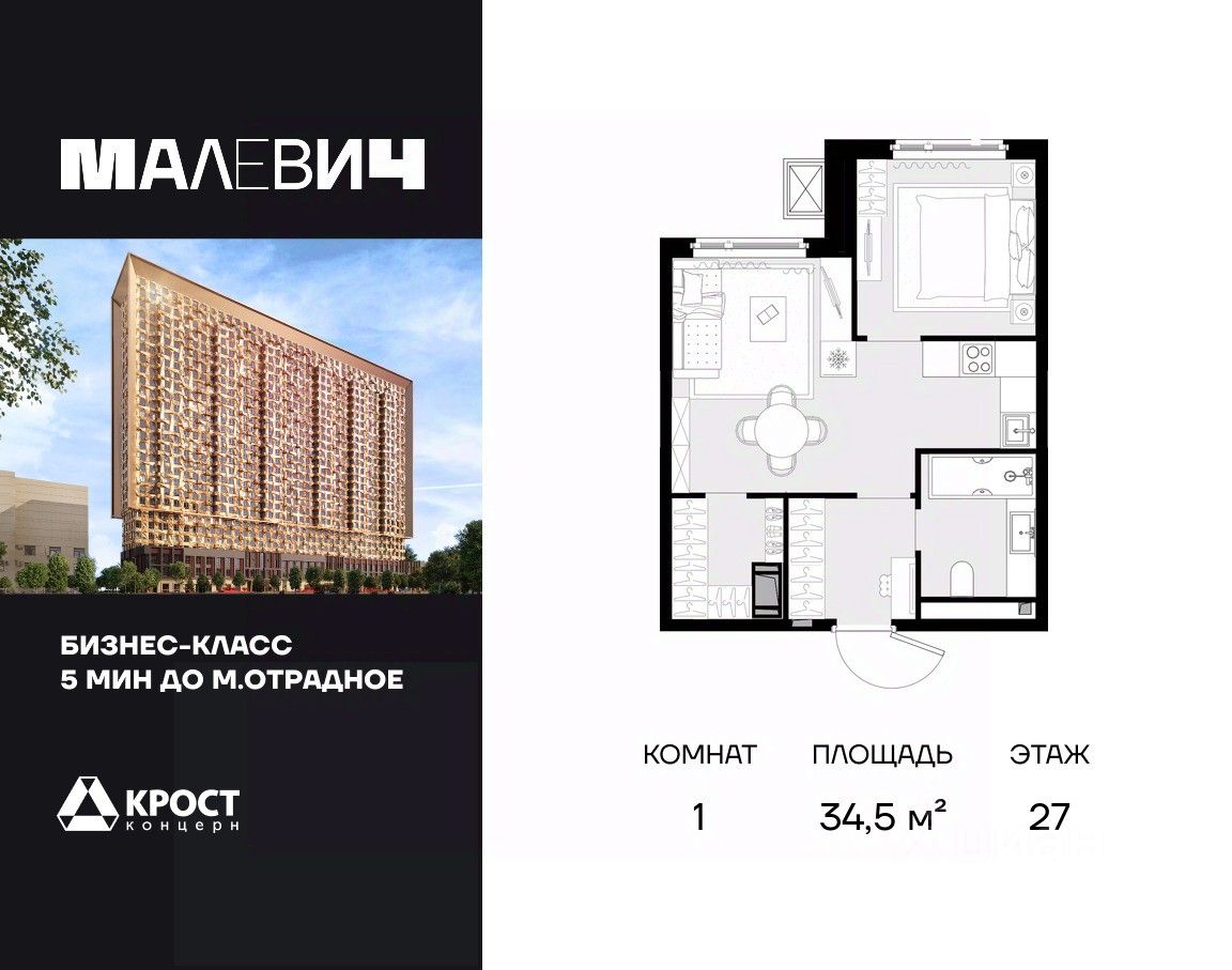 Продаётся 1-к квартира 34.5 кв.м. на 27-м этаже 28 этажного дома.
