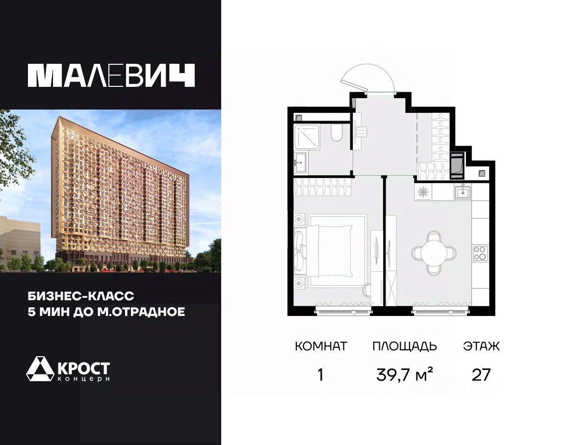 Продаётся 1-к квартира 39.7 кв.м. на 27-м этаже 28 этажного дома.
