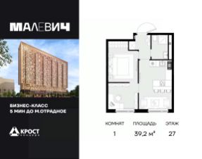 Продаётся 1-к квартира 39.2 кв.м. на 27-м этаже 28 этажного дома.