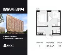 Продаётся 1-к квартира 33.5 кв.м. на 27-м этаже 28 этажного дома.
