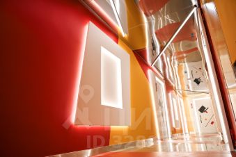 Здание состоит из двух объемов, один из которых сдвинут относительного другого в горизонтальной плоскости.