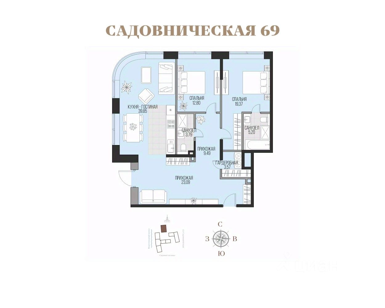 Проект включает 4 клубных корпуса на 1 га приватной территории с закрытым хвойным парком и инфраструктурой делюкс класса. Гранд-лобби "Садовнической 69" спроектировано архитектурным бюро Олега Клодта как продолжение общей архитектурной концепции квартала. В оформлении лобби используются те же благородные материалы, что и в фасадах: белый камень, бронзовые элементы, натуральный мрамор.