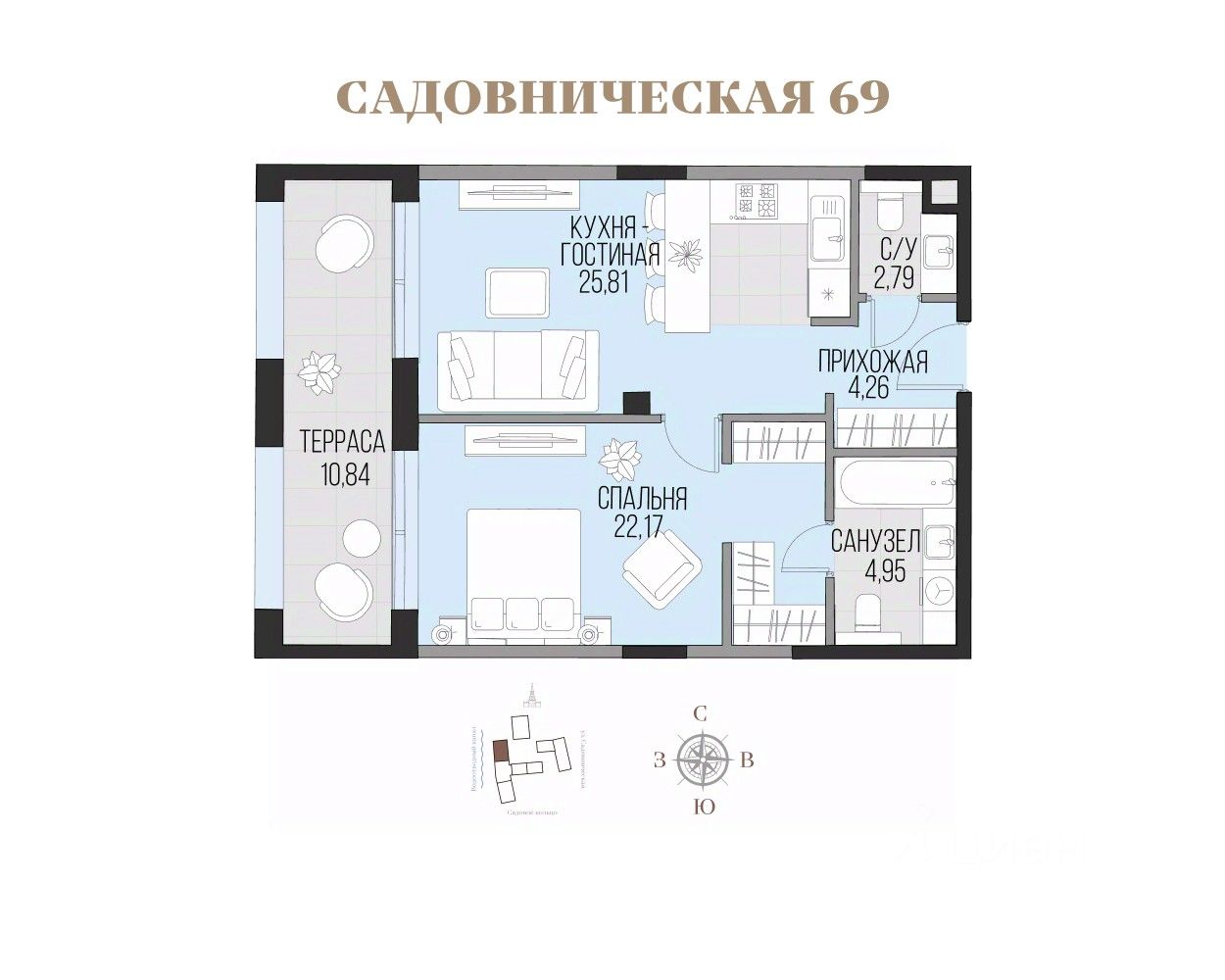 Проект включает 4 клубных корпуса на 1 га приватной территории с закрытым хвойным парком и инфраструктурой делюкс класса. Гранд-лобби "Садовнической 69" спроектировано архитектурным бюро Олега Клодта как продолжение общей архитектурной концепции квартала. В оформлении лобби используются те же благородные материалы, что и в фасадах: белый камень, бронзовые элементы, натуральный мрамор.