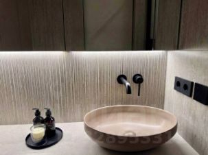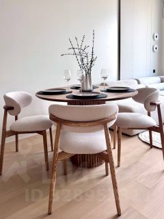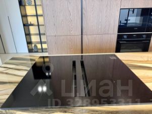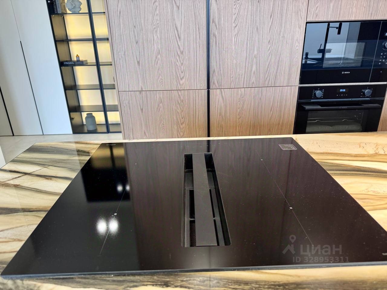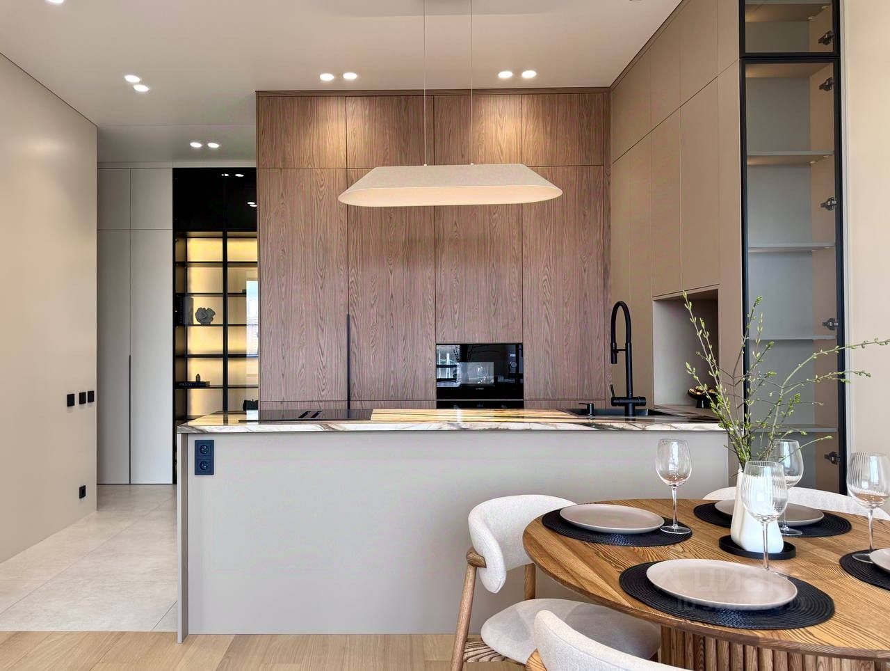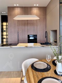 Вся мебель в квартире выполнена на заказ по индивидуальному проекту. В зоне кухни стол и стулья из натурального шпона, фасады кухни ламинированный МДФ, остров из крупноформатного керамогранита. Техника Liebherr и Bosh, винный холодильник. Ванна и раковины из литьевого мрамора в современном матовом исполнении.