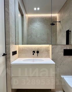 Теплые полы оборудованы во всех мокрых зонах, коридоре, кухне-гостиной и на лоджии. Напольное покрытие крупноформатный керамогранит и паркет. Также в квартире предусмотрено кондиционирование, датчики протечек, умные выключатели и электрокарнизы.