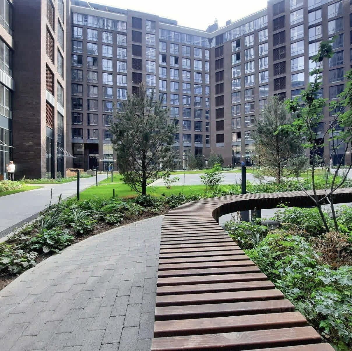 — Зеленые зоны и прогулочные дорожки на территории комплекса.