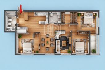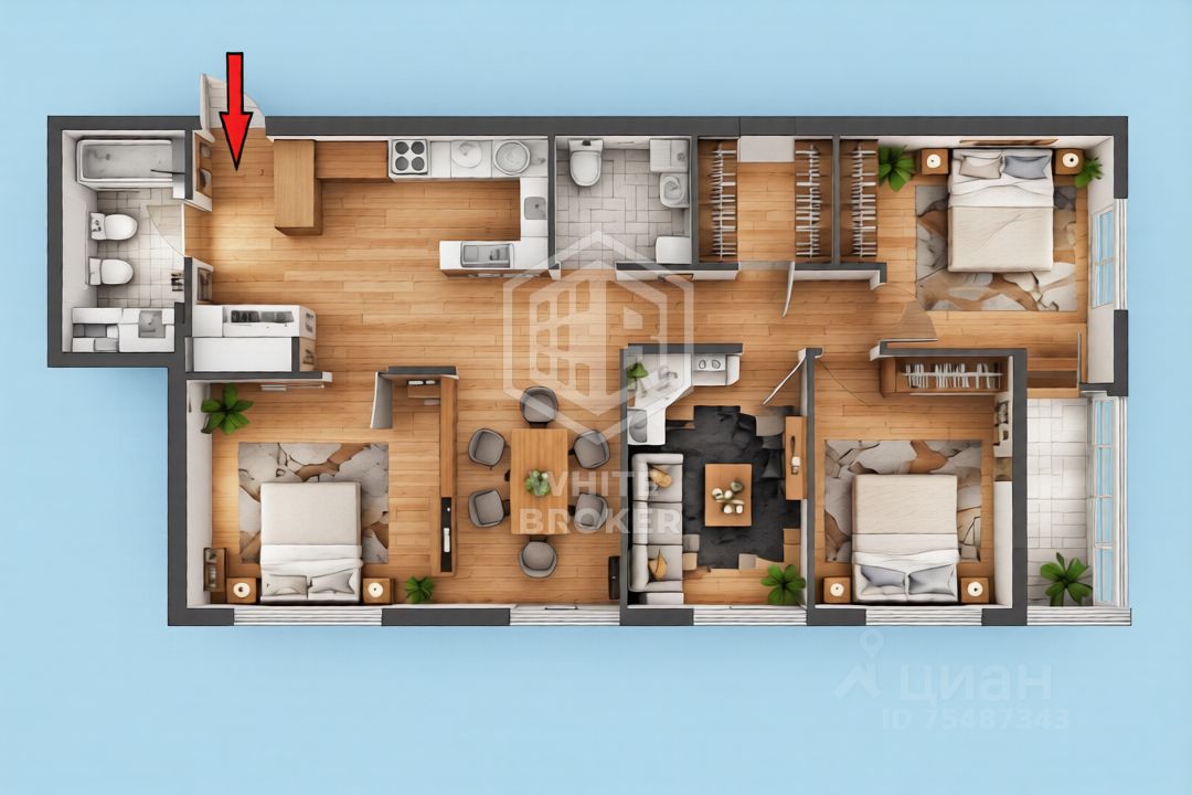 Три изолированные спальни + просторная гостиная, все мебелировано. Никто никому не мешает: подросток делает уроки, малыш спит, родители смотрят кино.