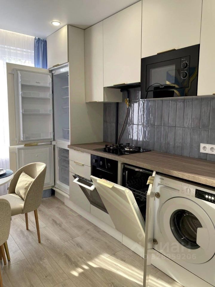 - Уютная и просторная кухня (укомплектована современной техникой: варочная панель, духовой шкаф, посудомоечная машина, холодильник, вытяжка, встроенная свч печь и интегрированная в кухонный гарнитур стиральная машина);