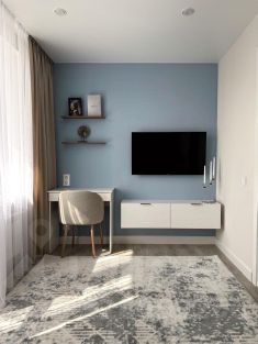 - Светлая гостиная с раскладывающимся диваном, а также выделенной рабочей зоной и ТВ зоной;