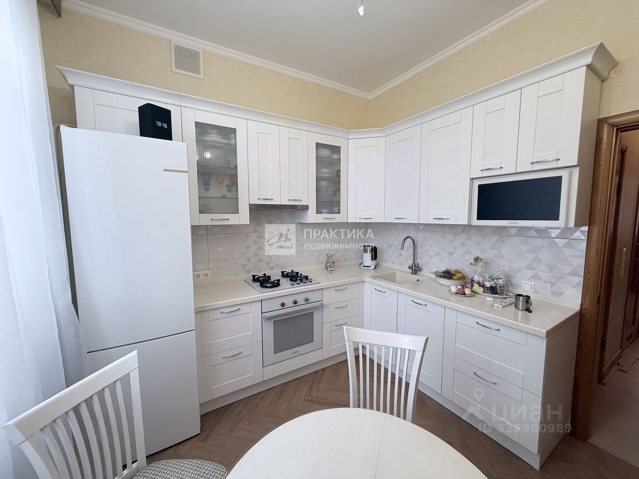 Квартира оснащена встроенной мебелью. Кухонный гарнитур укомплектован всей необходимой техникой, включая посудомоечную машину.
