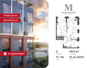 Продаётся 2-к квартира 45,9 кв.м. в ЖК "Михалковский" на 11-м этаже 18 этажного дома.