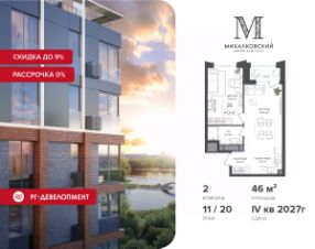 Продаётся 2-к квартира 46,0 кв.м. в ЖК "Михалковский" на 11-м этаже 20 этажного дома.