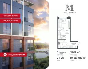 Продаётся студия 29,5 кв.м. в ЖК "Михалковский" на 2-м этаже 20 этажного дома.