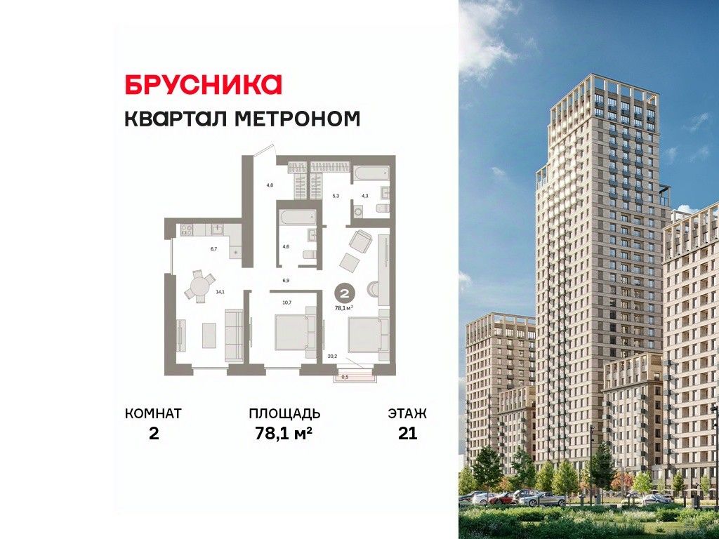 Квартира с кухней-гостиной и двумя спальнями в квартале "Метроном". Особенности планировки: вид во двор, гардеробная, мастер-спальня, предчистовая отделка, французский балкон.