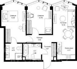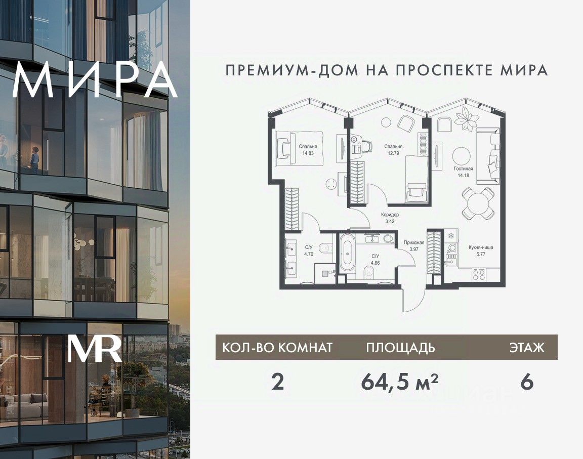 Продаётся 2-комнатная квартира общей площадью 64.52 м² без отделки в доме премиум-класса МИРА на 6-м этаже 24 этажного дома. Квартира расположена в корпусе 3.