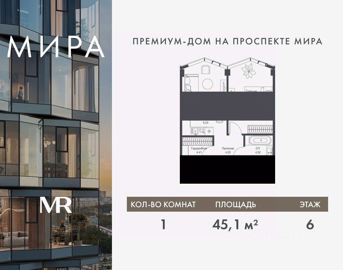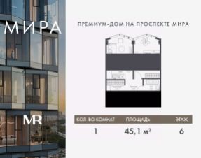 Продаётся 1-комнатная квартира общей площадью 45.08 м² без отделки в доме премиум-класса МИРА на 6-м этаже 24 этажного дома. Квартира расположена в корпусе 3.