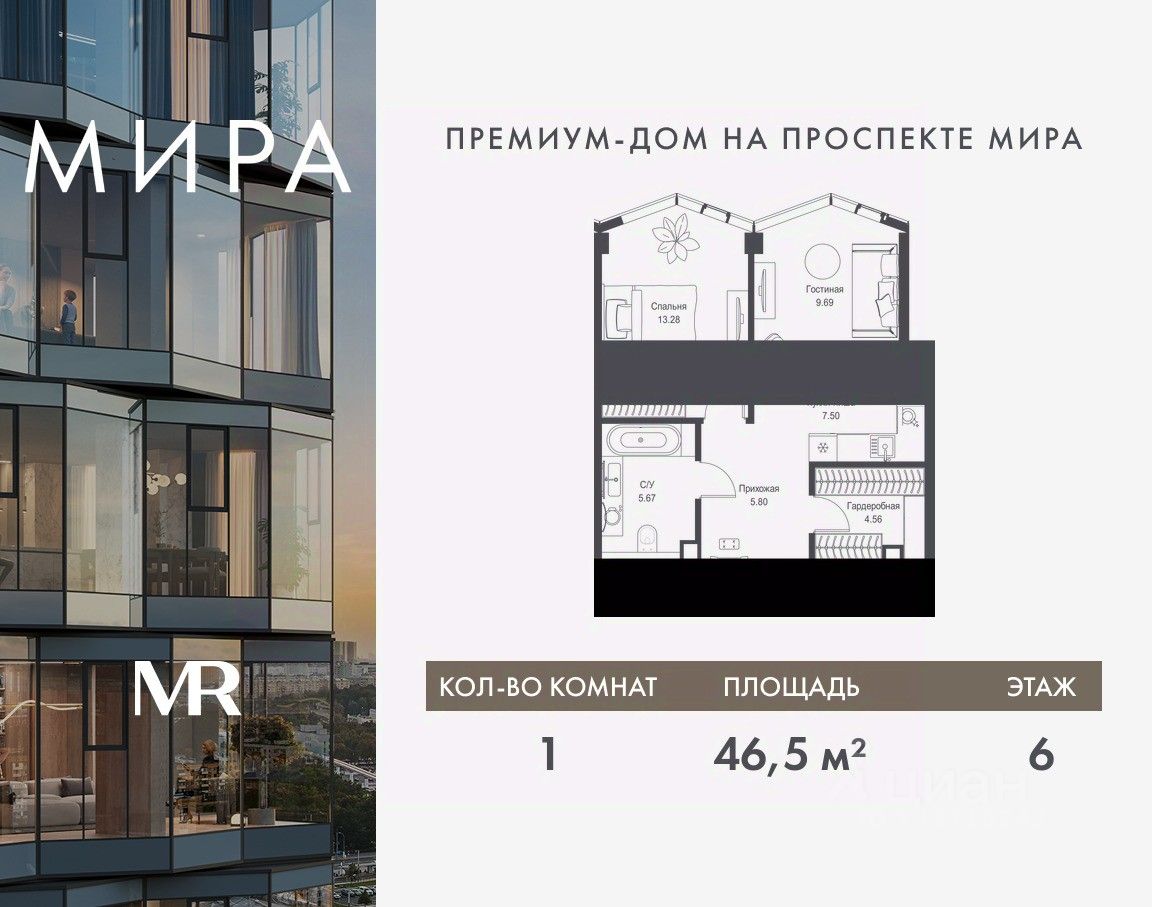Продаётся 1-комнатная квартира общей площадью 46.50 м² без отделки в доме премиум-класса МИРА на 6-м этаже 24 этажного дома. Квартира расположена в корпусе 3.