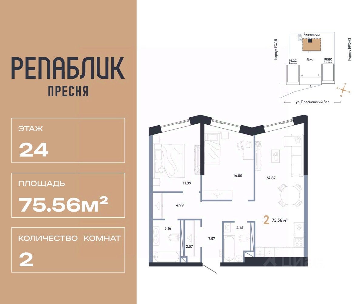 Продается 3комнатная квартира на 24 этаже от застройщика Страна Девелопмент. Площадь квартиры 75.56 кв. м.