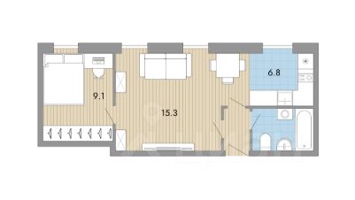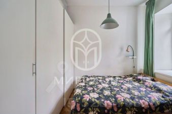 В квартире 4 окна, выходящие в зеленый тихий двор. Небольшая спальня 9,1 кв. м, гостиная 15.3 кв. м и кухня 6.8 кв. м. Санузел с ванной.