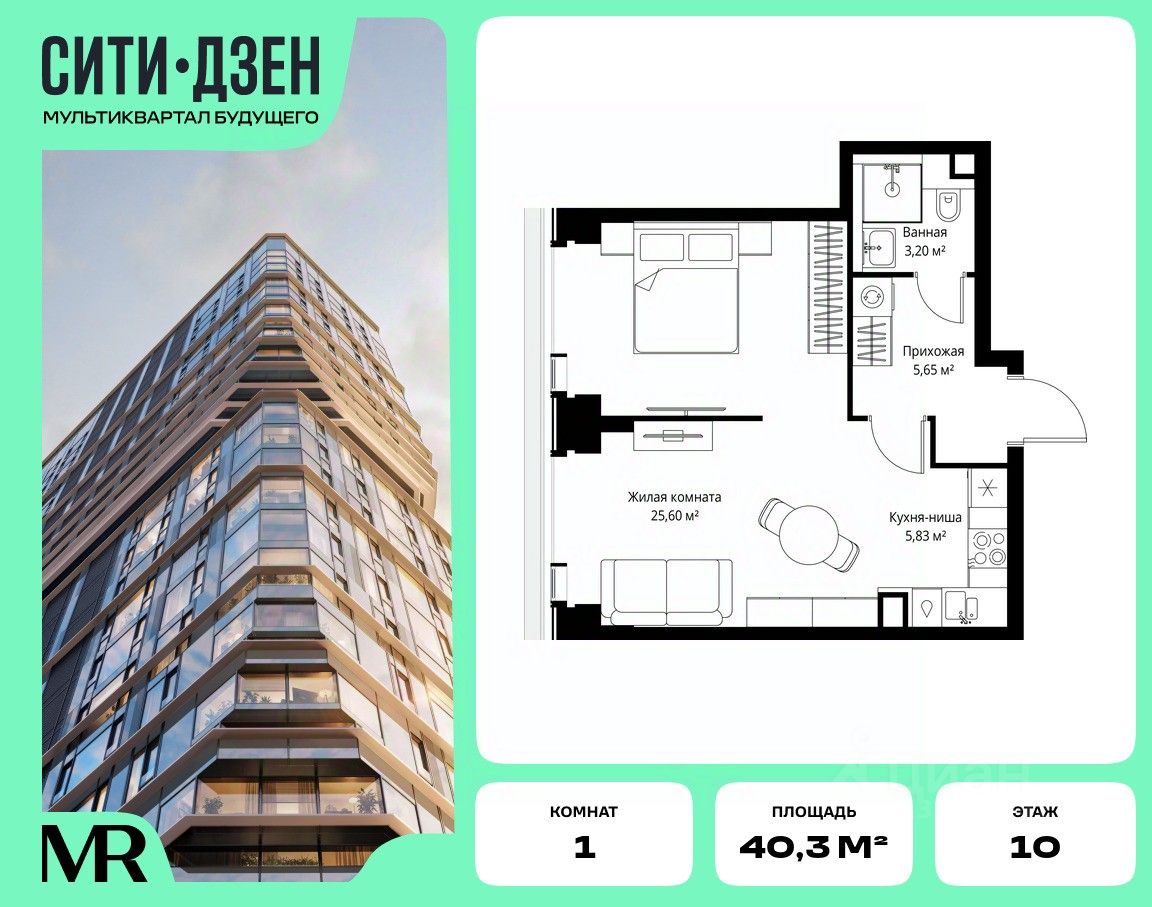 Продается 1-комнатная квартира от застройщика в жилом мультиквартале СИТИДЗЕН на 10-м этаже. Общая площадь лота составляет 40.28 м²