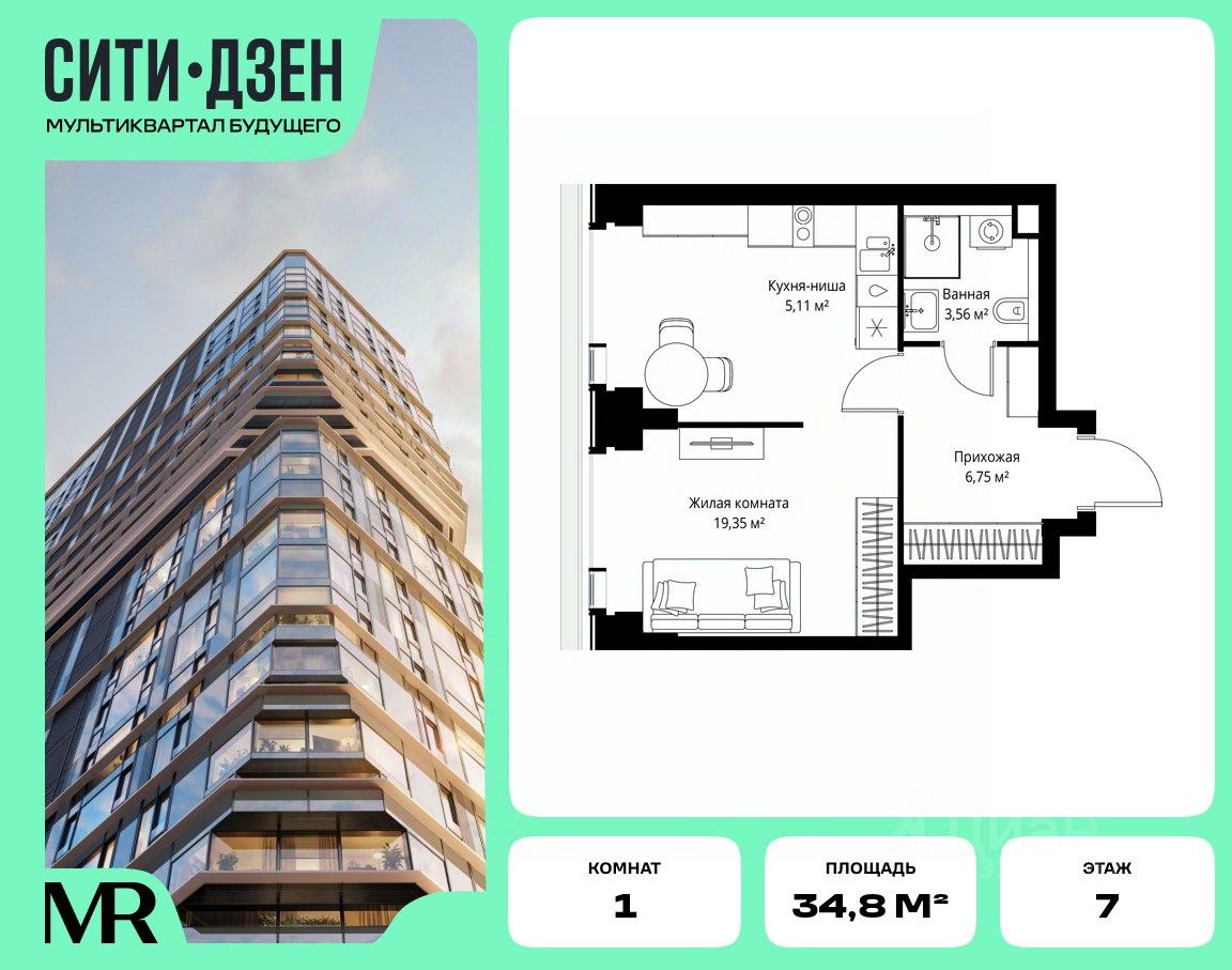 Продается 1-комнатная квартира от застройщика в жилом мультиквартале СИТИДЗЕН на 7-м этаже. Общая площадь лота составляет 34.77 м²