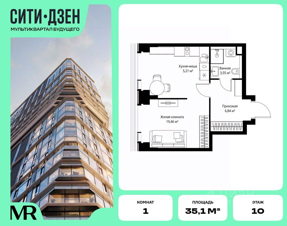 Продается 1-комнатная квартира от застройщика в жилом мультиквартале СИТИДЗЕН на 10-м этаже. Общая площадь лота составляет 35.06 м²