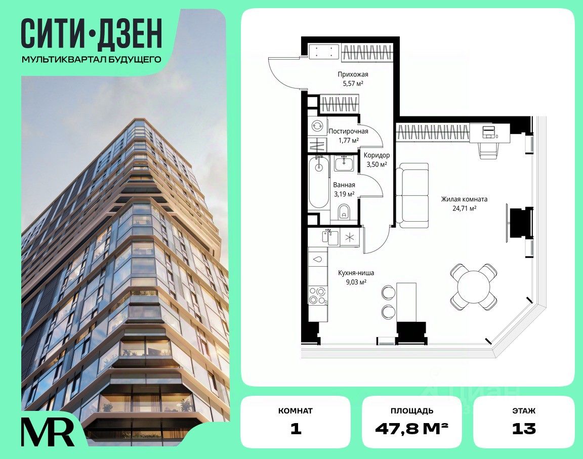 Продается 1-комнатная квартира от застройщика в жилом мультиквартале СИТИДЗЕН на 13-м этаже. Общая площадь лота составляет 47.77 м²