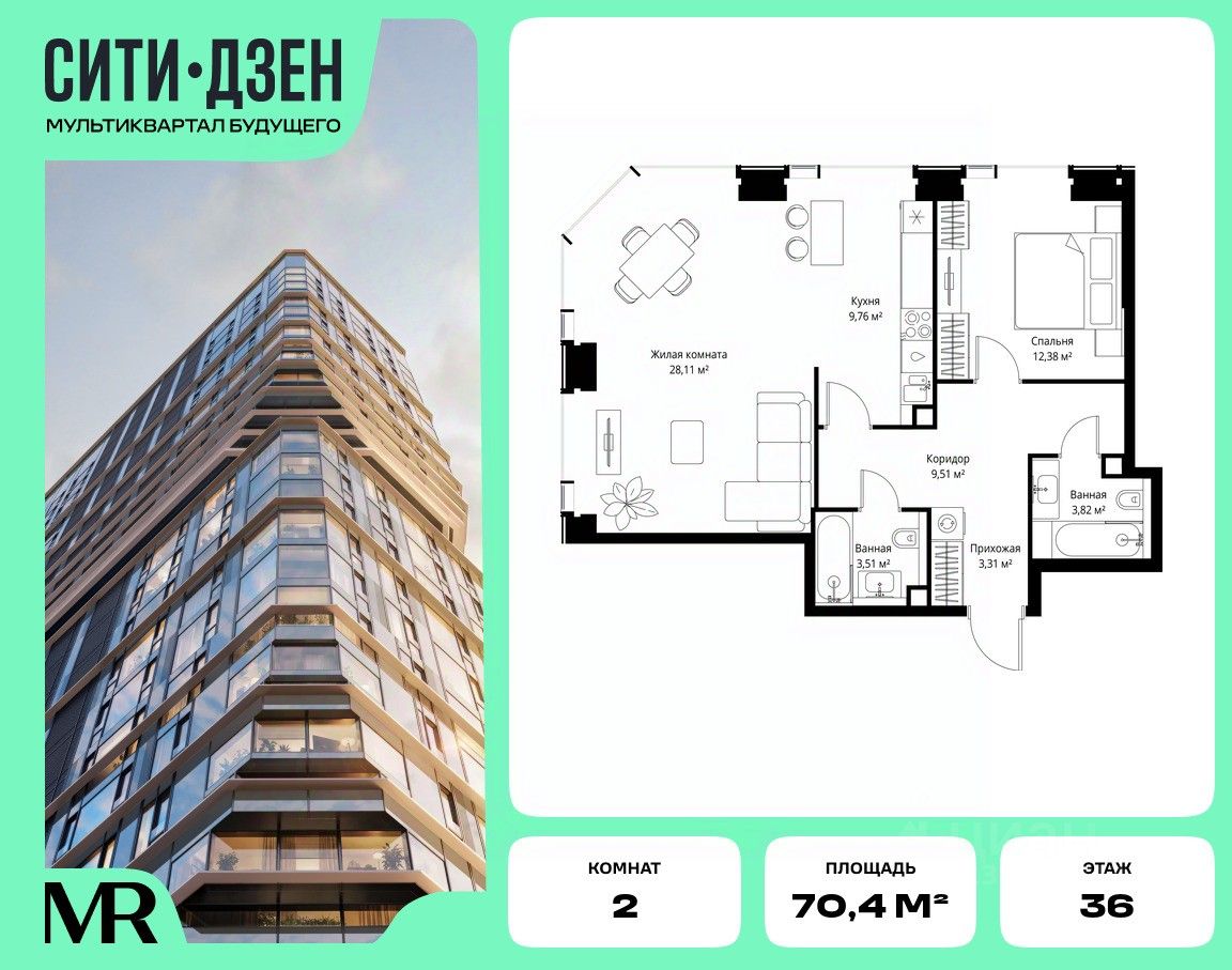 Продается 2-комнатная квартира от застройщика в жилом мультиквартале СИТИДЗЕН на 36-м этаже. Общая площадь лота составляет 70.40 м²