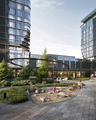 Концепция благоустройства территории мультиквартала предусматривает большое количество вечнозеленых растений, что создает ощущение максимальной близости к природе. Жителей квартала ждут места для отдыха, игр, занятий спортом и прогулок с домашними питомцами. В приватном дворе с собственным садом предусмотрена зеленая комьюнити-гостиная для дружеского отдыха и общения, одна из стен которой подходит для кинопроекций, а также зеленый рабочий кабинет в саду (бизнес-гардена), оборудованный wi-fi станцией и usb-разъёмами для зарядки устройств. Маленьких жителей ждут авторские игровые площадки для разных возрастных групп (от 0 до 12 лет).