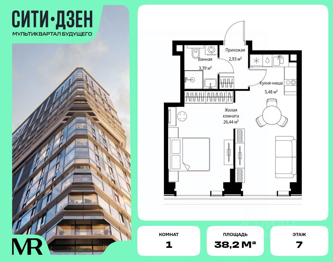 Продается 1-комнатная квартира от застройщика в жилом мультиквартале СИТИДЗЕН на 7-м этаже. Общая площадь лота составляет 38.24 м²