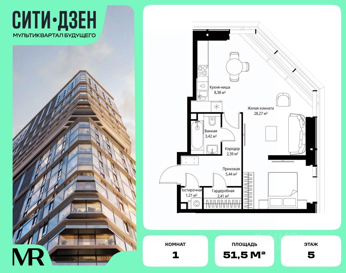 Продается 1-комнатная квартира от застройщика в жилом мультиквартале СИТИДЗЕН на 5-м этаже. Общая площадь лота составляет 51.52 м²