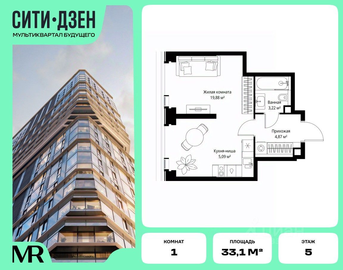 Продается 1-комнатная квартира от застройщика в жилом мультиквартале СИТИДЗЕН на 5-м этаже. Общая площадь лота составляет 33.06 м²