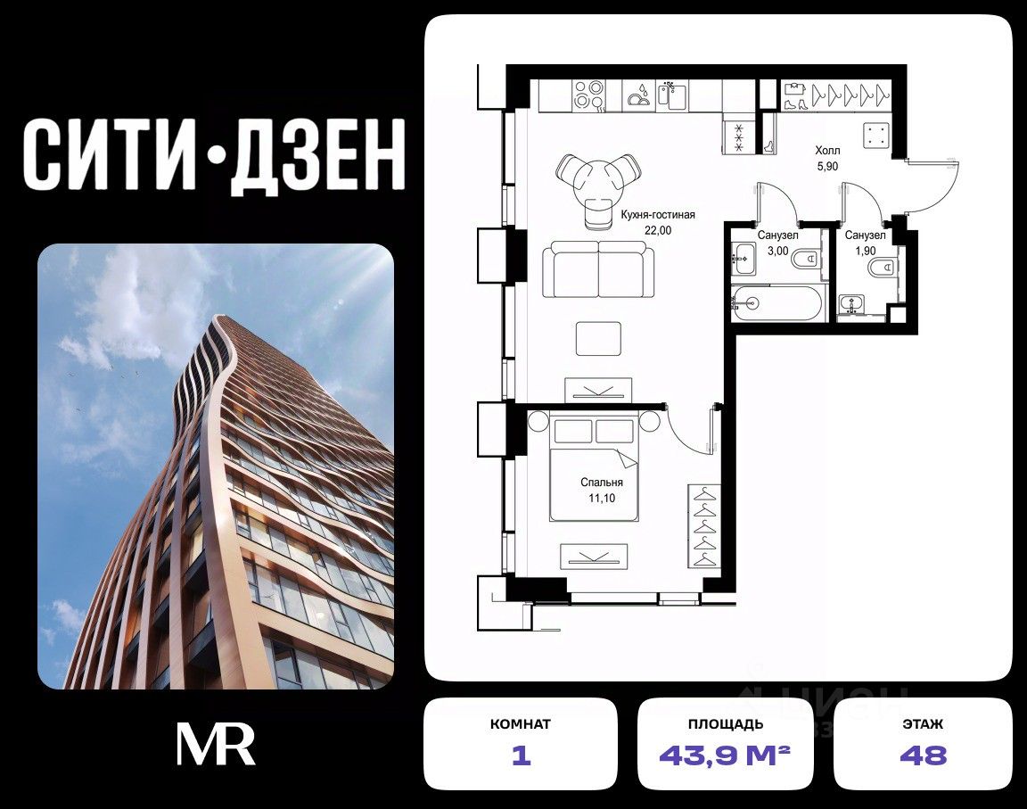 Продается 1-комнатная квартира от застройщика в жилом мультиквартале СИТИДЗЕН на 48-м этаже в корпусе #6. Общая площадь лота составляет 43.90 м²