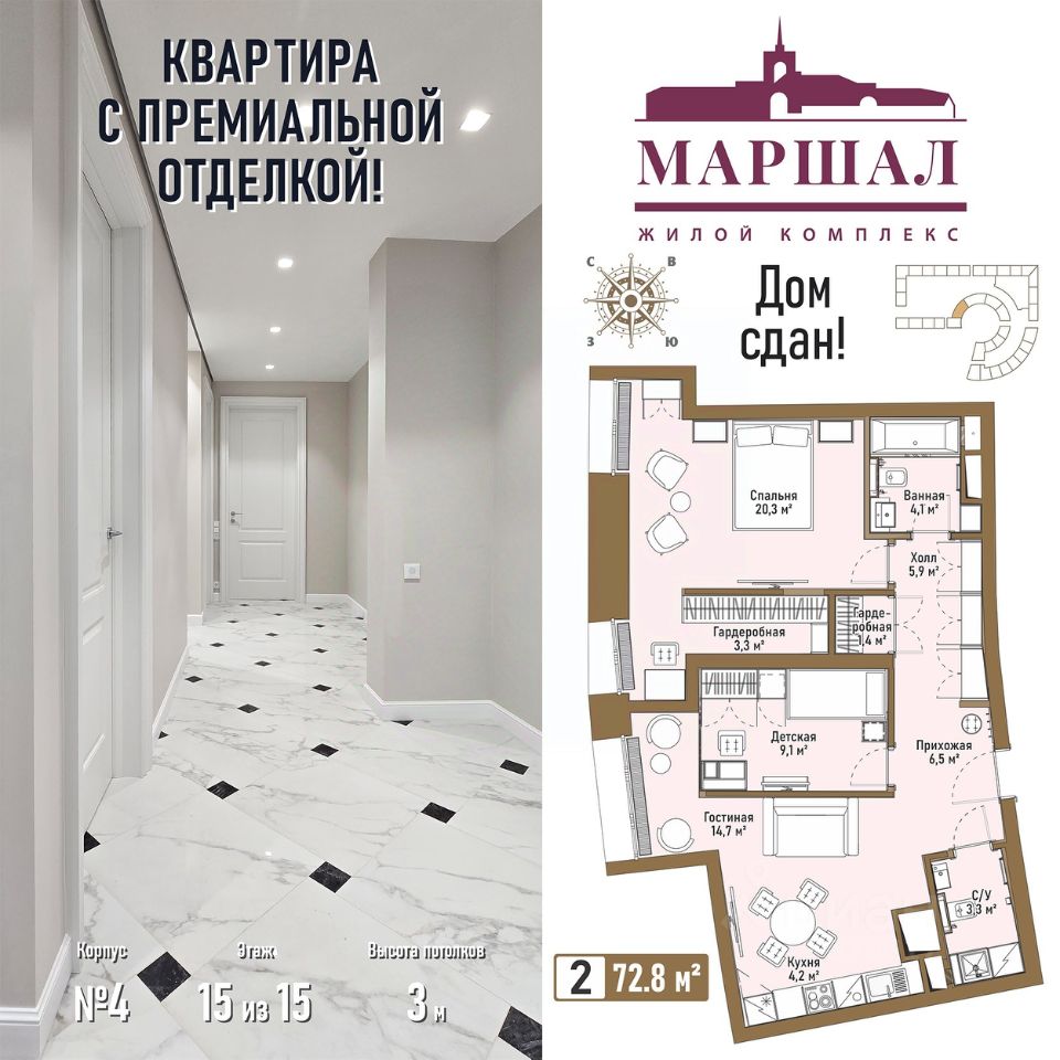 Продаётся 2-комнатная квартира в сданном доме (Маршала Рыбалко, 2К4), срок сдачи: IV-кв. 2011, общей площадью 72.07 кв.м., на 15 этаже. Готовая квартира в элитном МФК "Маршал" с премиальной отделкой "под ключ" (экологичное напольное покрытие - инженерная доска Greenline и керамогранит, высококачественные системы кондиционирования и сантехническое оборудование), выполненной европейскими специалистами по эксклюзивным дизайн-проектам, подчеркнет высокий статус владельца.