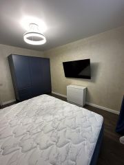 Спальня: кровать с матрасом 200/200, шкаф и прикроватные тумбочки Аскона, кондиционер Royal Clima. Также установлен бризер Ballu (приток отфильтрованного воздуха в квартиру без проветривания окон, актуально для аллергиков и маленьких детей.
