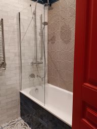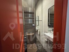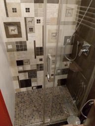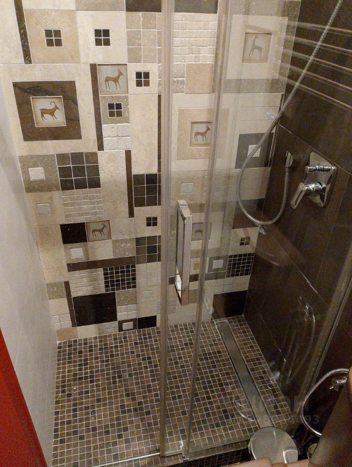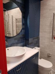 Рядом при входе гостевой санузел с душевой, где подобрана мозаика из натурального камня и авторское панно в зоне душа, также скрытый шкаф для хранения.