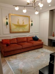 После попадаем в уютную гостиную зону с мягким диваном и чудесной атмосферой спокойствия и отдыха. В гостиной встроенные шкафы увеличенного размера и органичная ТВ зона.