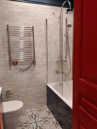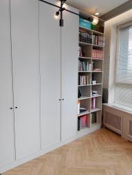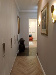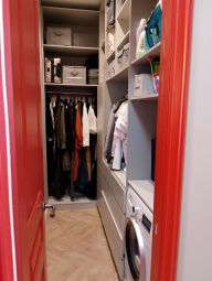 По дороге прекрасно организованное пространство для хранения всего и всякого в больших шкафах до потолка. Сделана функцианальная гардеробная с постирочной и основной санузел с итальянской плиткой и сантехникой Villeroy & Boch.