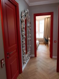 В квартире яркие сочные двери с нестандартным открыванием которые позволяют сэкономить место при открытии и приятно радуют глаз в московском климате.